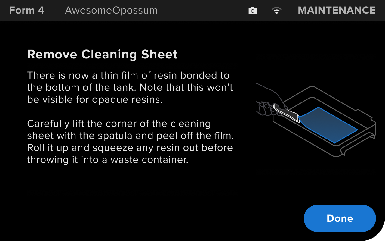인쇄에 실패하면 탱크에 작고 일부 경화된 수지 조각이 떠 있거나 경화된 수지가 탱크 바닥의 필름에 달라붙을 수 있습니다. 탱크 필름의 이물질을 손으로 제거하거나 클리닝 시트를 인쇄합니다. 클리닝 시트는 수지 탱크를 가로질러 얇은 층으로 인쇄되어 경화 및 부분 경화 수지를 하나의 조각으로 묶습니다. 그런 다음 인쇄 실패와 함께 세척 시트를 탱크에서 제거할 수 있습니다.