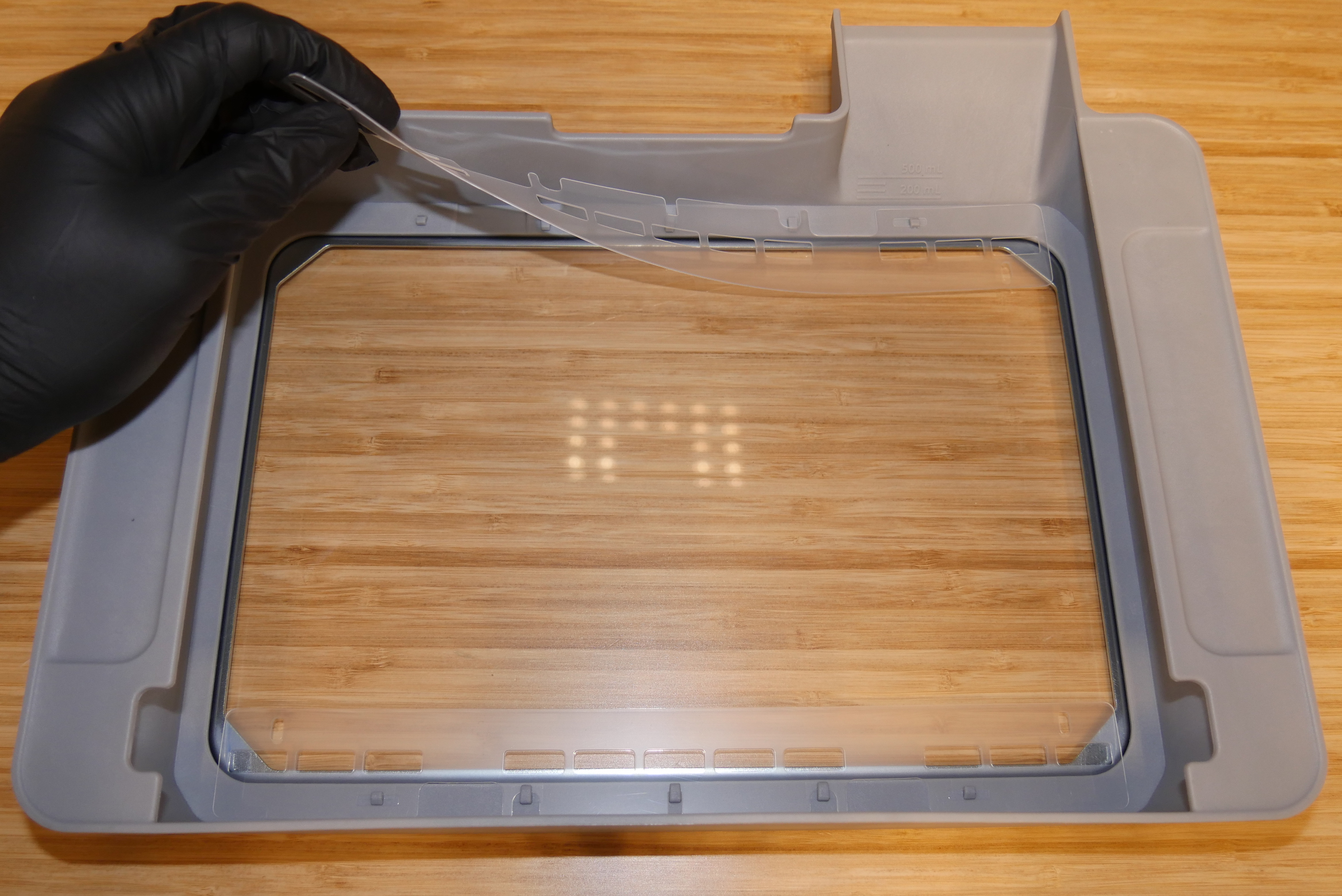 - 탱크 필름 청소 방법: 빈 수지 탱크를 깨끗하고 평평한 표면에 놓습니다.